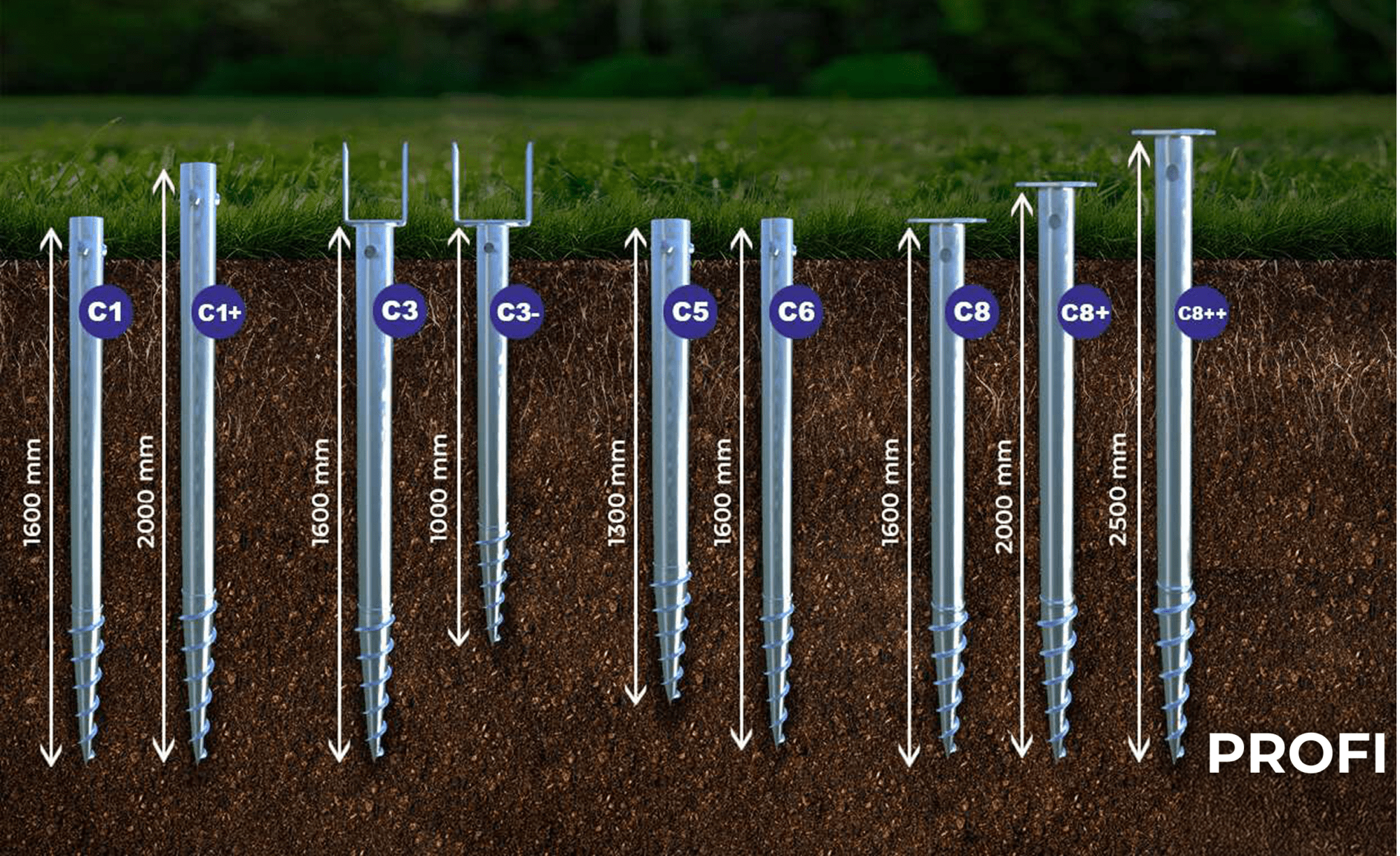 Zemné vruty PROFI sú vhodné pre vysoké zaťaženie. Sú zamerané hlavne na ťažké stavby ako: drevodomy, oceľové konštrukcie, móla, pódia, vysoké ploty, brány, montované haly alebo bilboardy... Montáž svojpomocne pomocou montážného náradia alebo využite našu odbornú montáž. Hrúbky steny pri PROFI vrutoch je 3 mm.